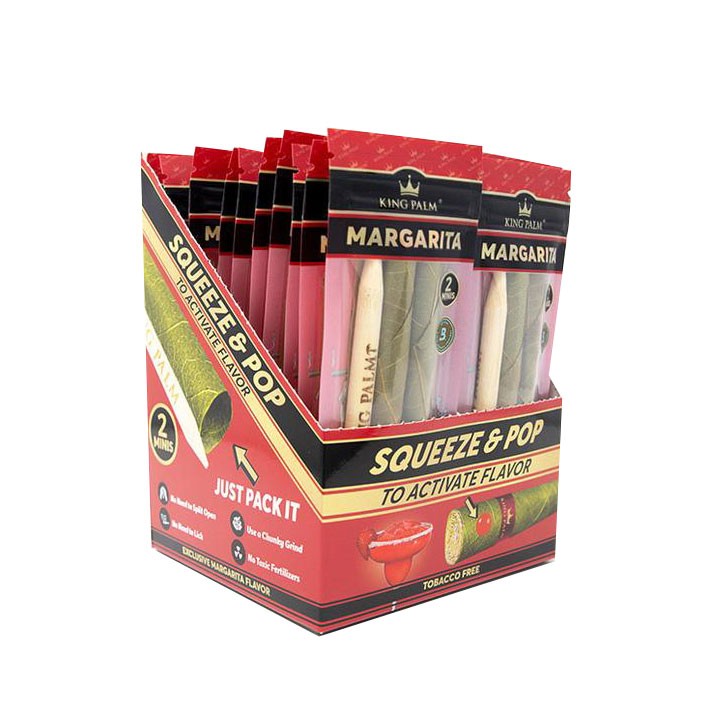 King Palm Margarita Strawberry flavor is available now and one of the great additions to the King Palm Flavor line. Just squeeze and pop the flavor ball in the corn husk tip to activate the flavor anytime. This King Palm Margarito containing 2 Mini Size pre-rolls, one packing stick, and a 1g Boveda humidity pack in each pouch. Each individual Mini Size roll can hold up to 1 gram of flower. You can taste the great flavor without burning or smoking the flavor because the flavor ball will be popped inside the Corn Husk Filter Tip, which should never be smoked.